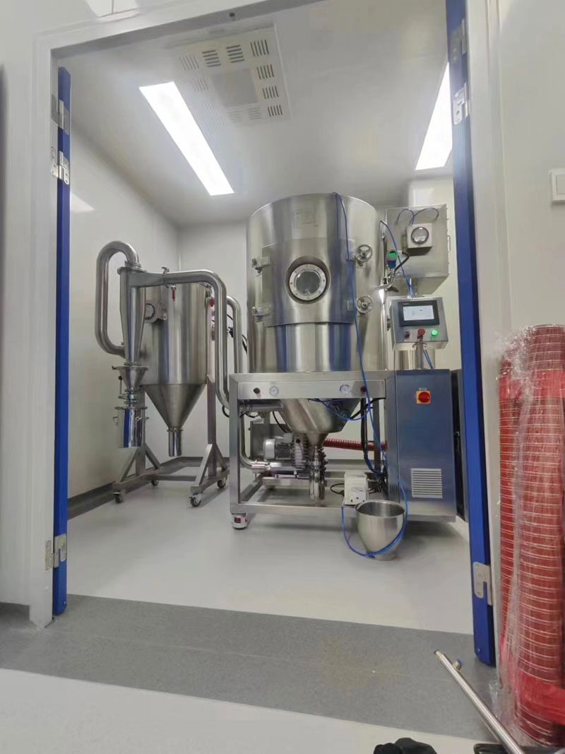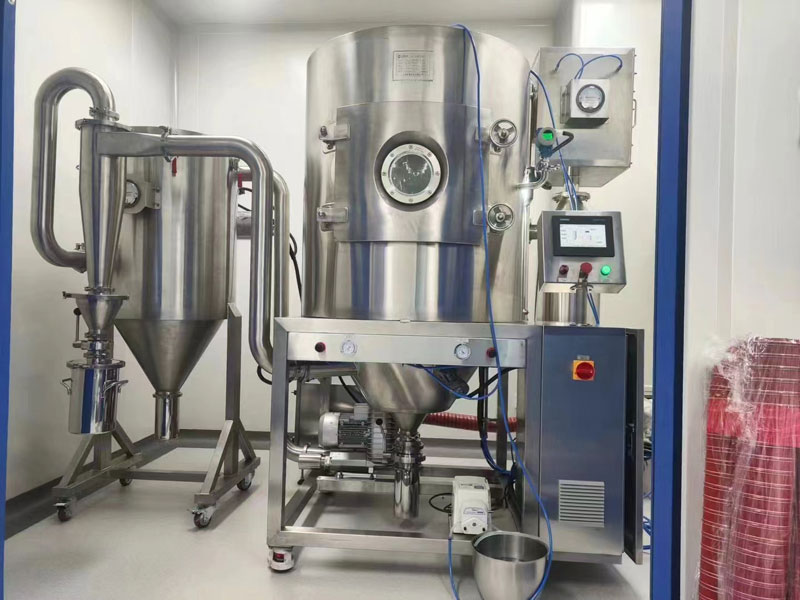 本機的工作原理是空氣通過過濾器和加熱裝置后,進入干燥室頂部的熱風分配器,通過熱風分配器的熱空氣均勻的進入干燥室內,并呈螺旋狀轉動,同時將料液送到裝置在干燥室頂部的離心噴霧頭,料液被噴成績效的霧狀液滴,使料液和熱空氣接觸的表面積大大增加,水分迅速蒸發(fā),在極短的時間內干燥成品。較粗的成品由干燥器底部的收集筒回收,廢氣由離心風機排出。